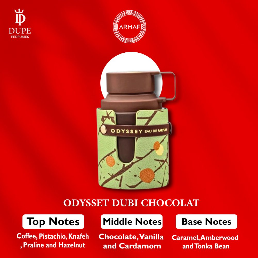 Odyssey Dubai Chocolat by Armaf is a Oriental Vanilla fragrance for women and men. This is a new fragrance. Odyssey Dubai Chocolat was launched in 2025. Top notes are Coffee, Pistachio, Knafeh, Praline and Hazelnut; middle notes are Chocolate, Cardamom and Vanilla; base notes are Amberwood, Tonka Bean and Caramel.